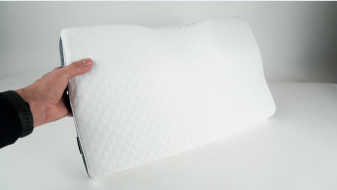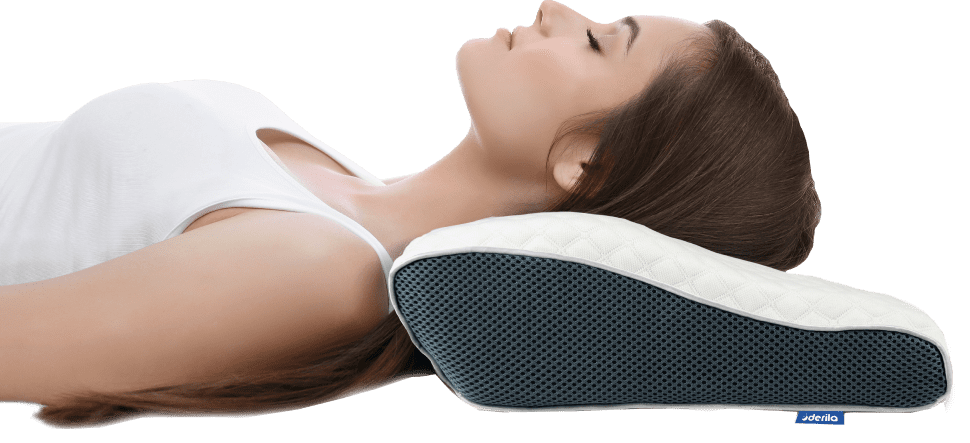 Coloca la Derila de forma que el extremo grande del contorno quede debajo de la nuca. Esto permitirá que la espuma viscoelástica se adapte a tus curvas naturales. También puedes colocar la almohada entre las rodillas para un mayor confort.